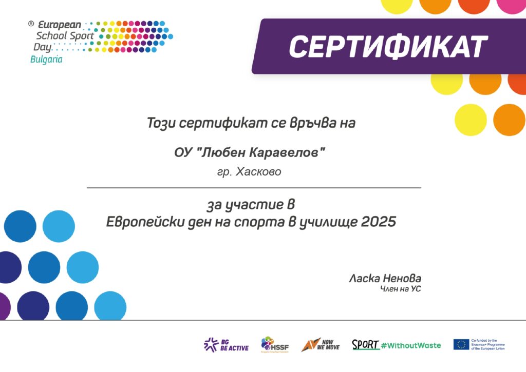 Училището получи сертификат за участие в Европейския ден на спорта 2025, като признание за активния си принос към насърчаването на физическата активност. Безупречната и успешна организация на разнообразните спортни дейности позволи масовото включване на ученици и учители. Сертификатът е доказателство за ангажимента на институцията към популяризирането на здравословен начин на живот и европейските спортни инициативи.