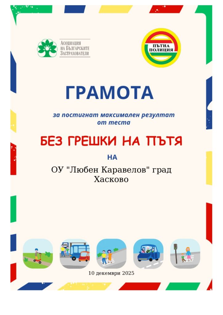 С гордост съобщаваме, че ОУ „Любен Каравелов“ получи престижна Грамота за постигнат максимален резултат от теста по инициативата „Без грешки на пътя“.